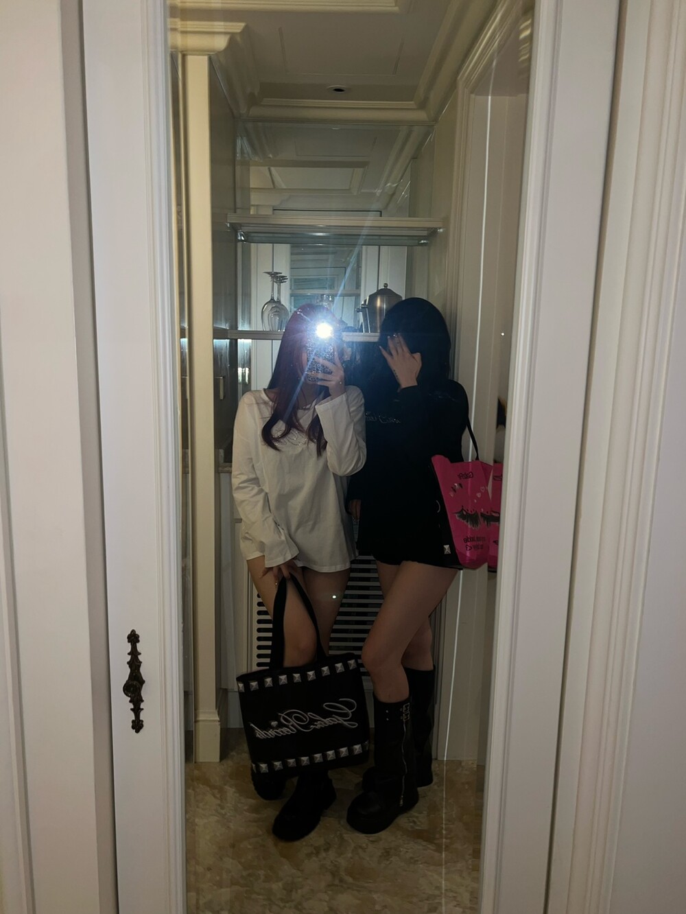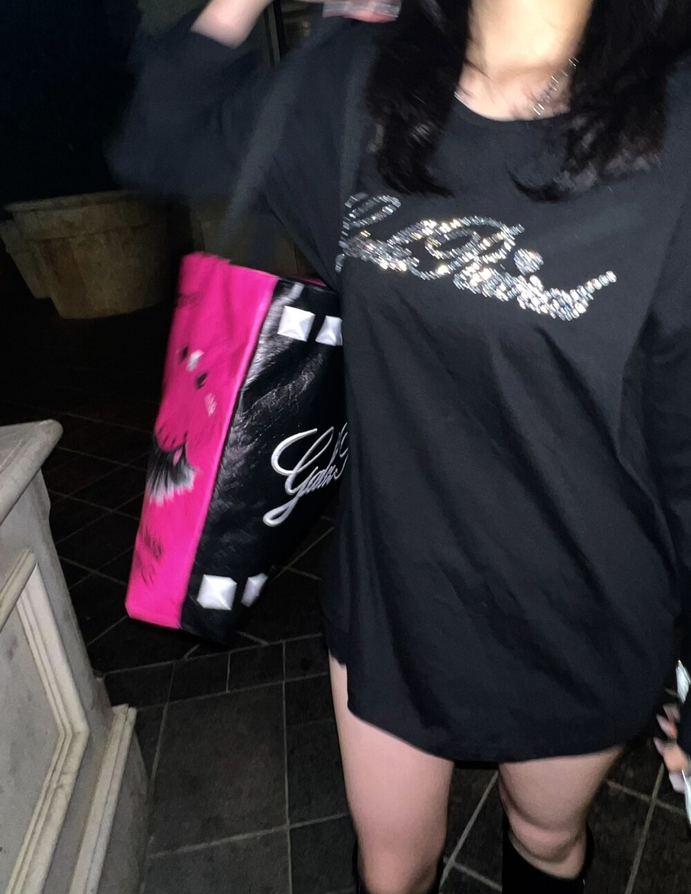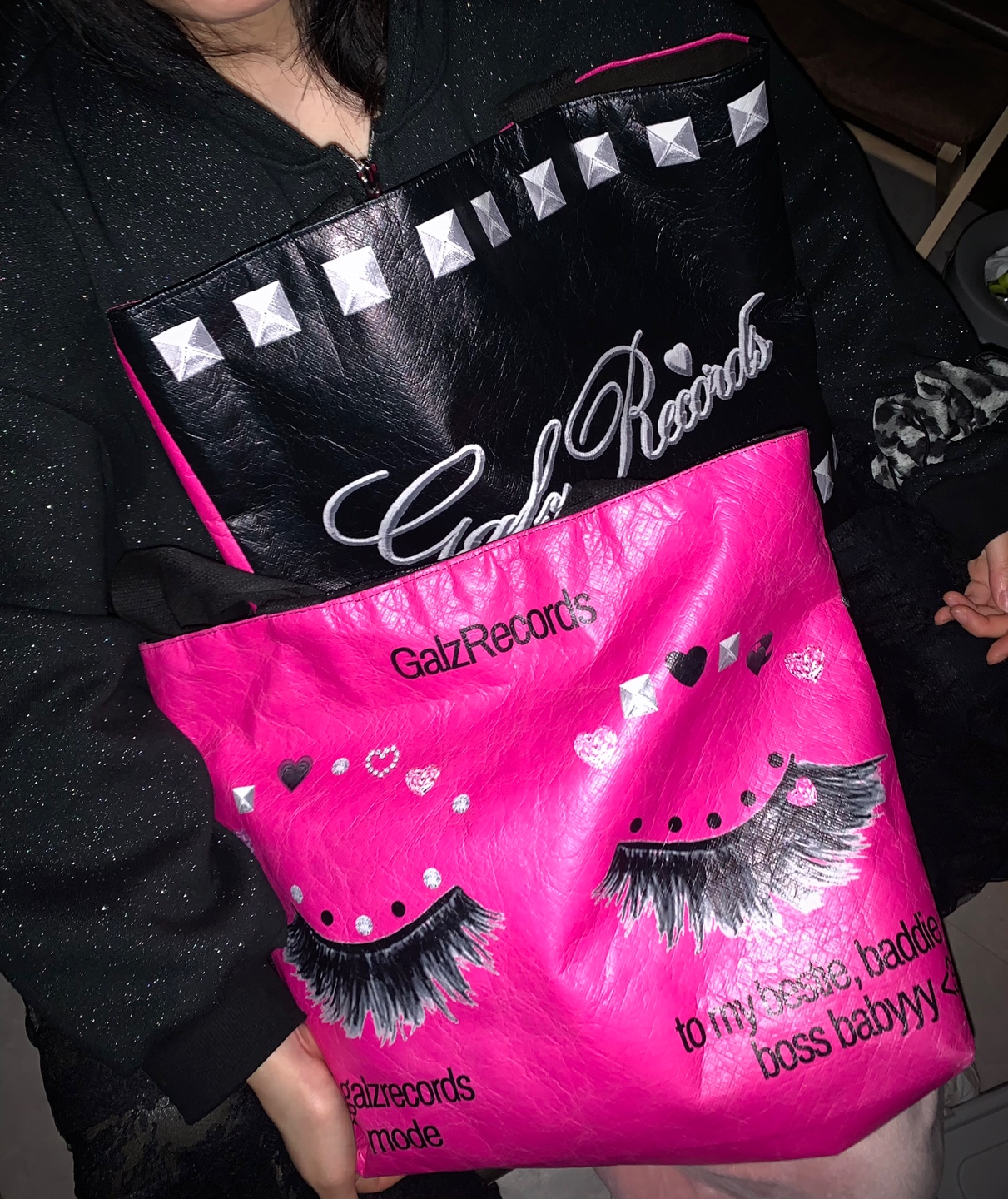 Experience GalzRecords’ signature party and rock-chic GAL mood with the BADDIE BAG. This one design, two styles bag features a hot pink side that embodies GalzRecords’ playful party 🪩 GAL vibe, and a black side accented with metallic logo and studs for a bold rock-chic attitude — offering high styling versatility.