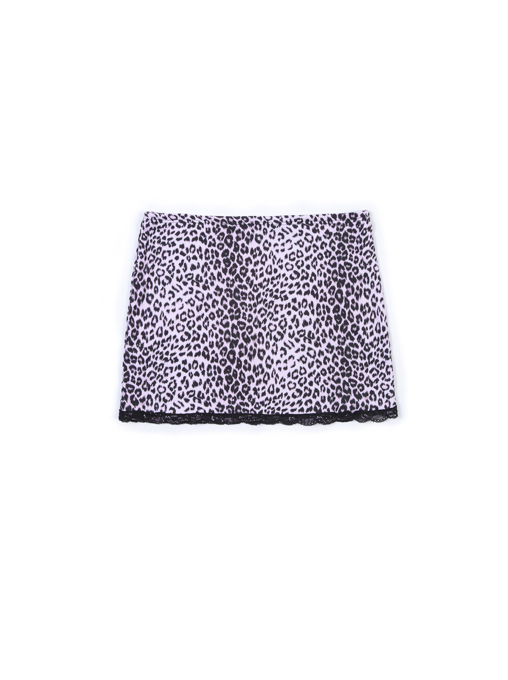 This mini-length, mid-rise skirt features a delicate lace trim at the hem, creating a girlish yet bold “Barbie” vibe.